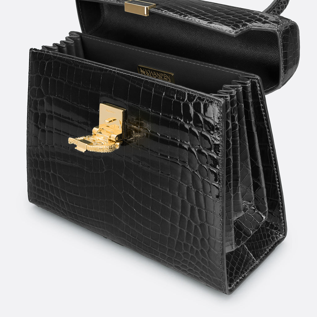 The KP Homage, Crescent series carries the KWANPEN Crescent hardware - showcasing the exquisite, Italian crafted, crocodile fitting. The crescent shape clasp emulates the sickle of the moon symbolizing the ebb and flow of life as well as to honour the journey of KWANPEN.